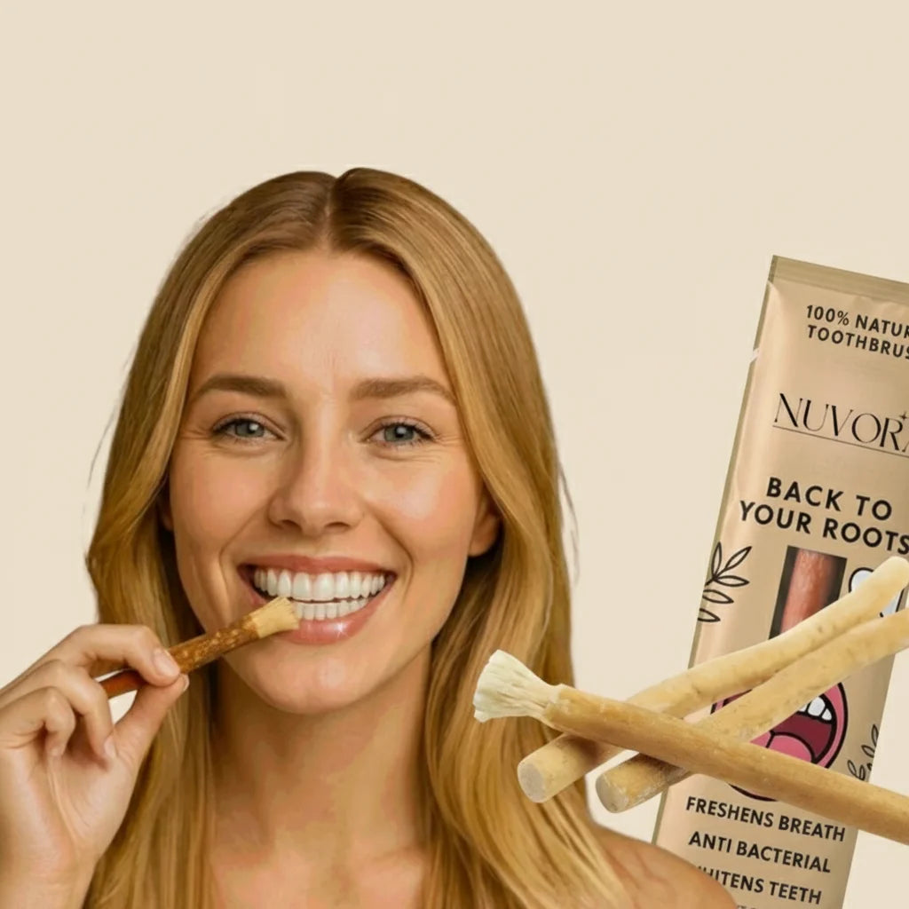 NUVORA Miswak naturally whitens teeth by gently removing surface stains, revealing a brighter smile without harsh chemicals. Experience up to 67% whiter teeth in just one week, guaranteed!